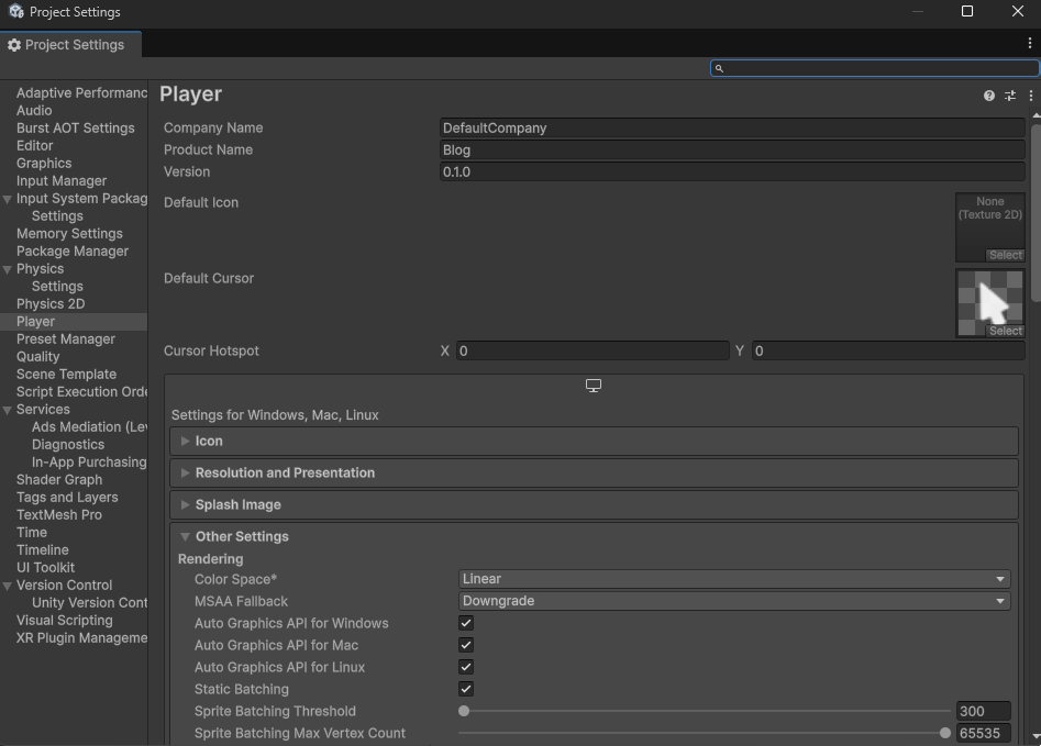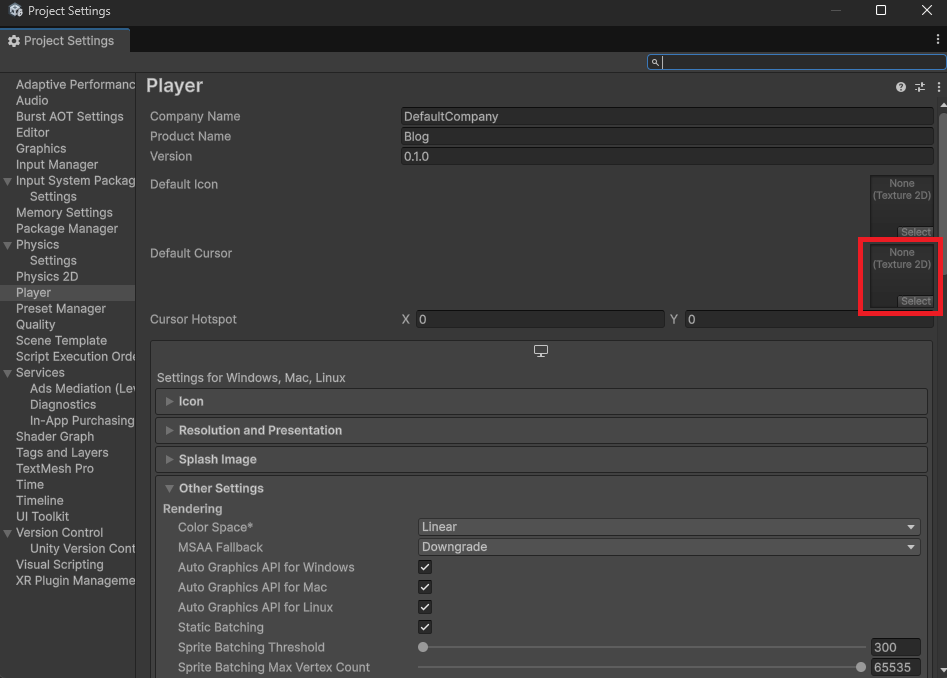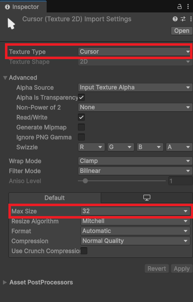 커서 이미지의 인스펙터 창에서 아래와 같이 설정을 변경합니다.
