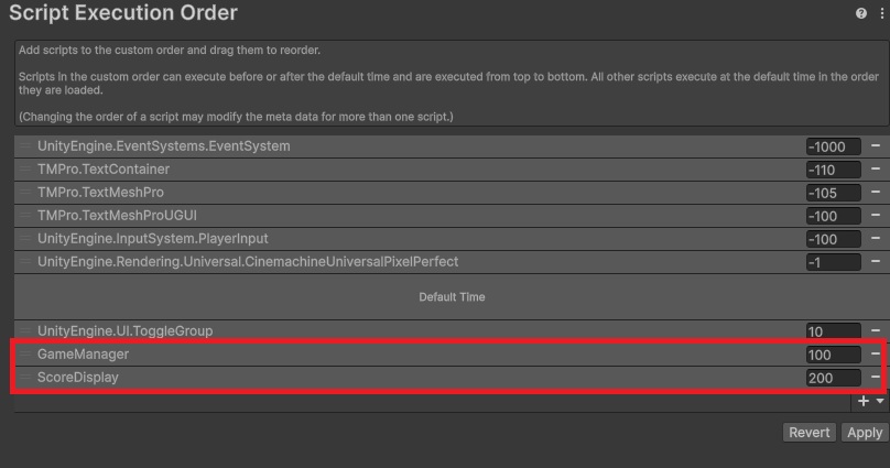 이전의 문제를 해결하기 위해 GameManager가 ScoreDisplay보다 먼저 실행되도록 조정했습니다.
