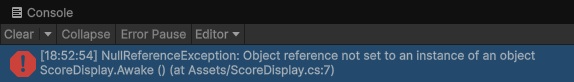 에러 로그를 읽어보면 ScoreDisplay스크립트의 7번째 줄