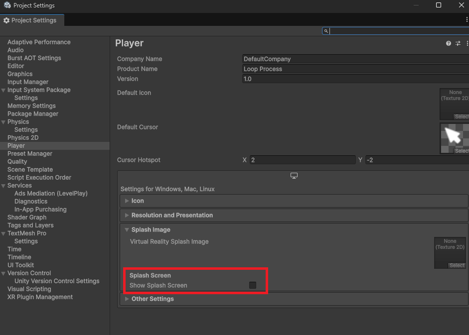 스플래쉬 이미지 제거 [Project Settings] -> [Player] -> [Splash Image] 위 창에서 Show Splash Screen을 체크 해제 하면 유니티 스플래쉬 이미지가 나오지 않습니다. 클립보드에 복사 이메일에 공유 X (Twitter)에 공유 Facebook에 공유 이전 글 유니티2D SortMode 변경 (최신버전) [유니티] 관련 포스트 유니티 마우스 드래그 이동 구현 방법 [유니티 C#]2026년 02월 05일 유니티 슬라이더 변화값 감지 방법 [유니티 C#]2026년 01월 31일 유니티 벡터(Vector) 정리 [유니티 C#]2026년 01월 21일 댓글 남기기 답글 취소 이메일 주소는 공개되지 않습니다. 필수 필드는 *로 표시됩니다 이름 * 이메일 * 웹사이트 댓글 달기 * 다음에 댓글을 달 때를 위해 이 브라우저에 내 이름, 이메일, 웹사이트를 저장합니다.댓글 달기
