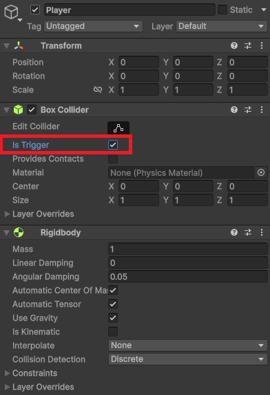 - 충돌한 오브젝트 중 최소 하나가 Rigidbody 컴포넌트를 가지고 있을 것