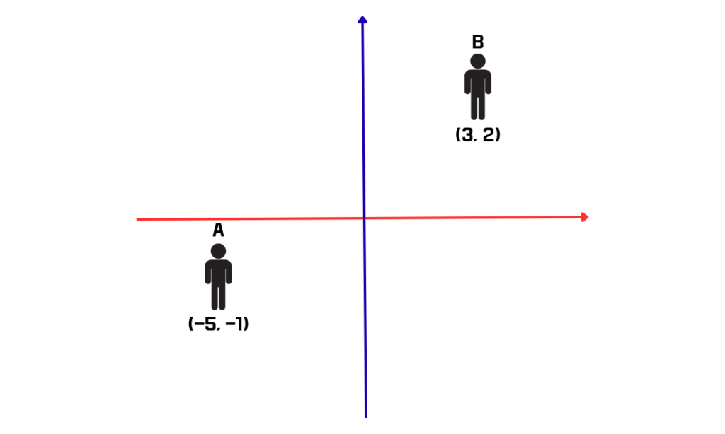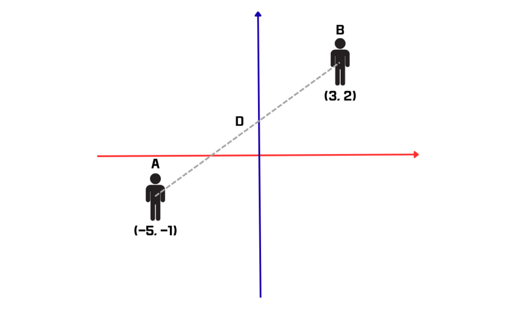 이렇게 두 지점의 좌표를 알고 있으면 직각삼각형의 빗변의 길이를 구하는 식으로 두 점 사이의 거리를 알 수 있습니다.